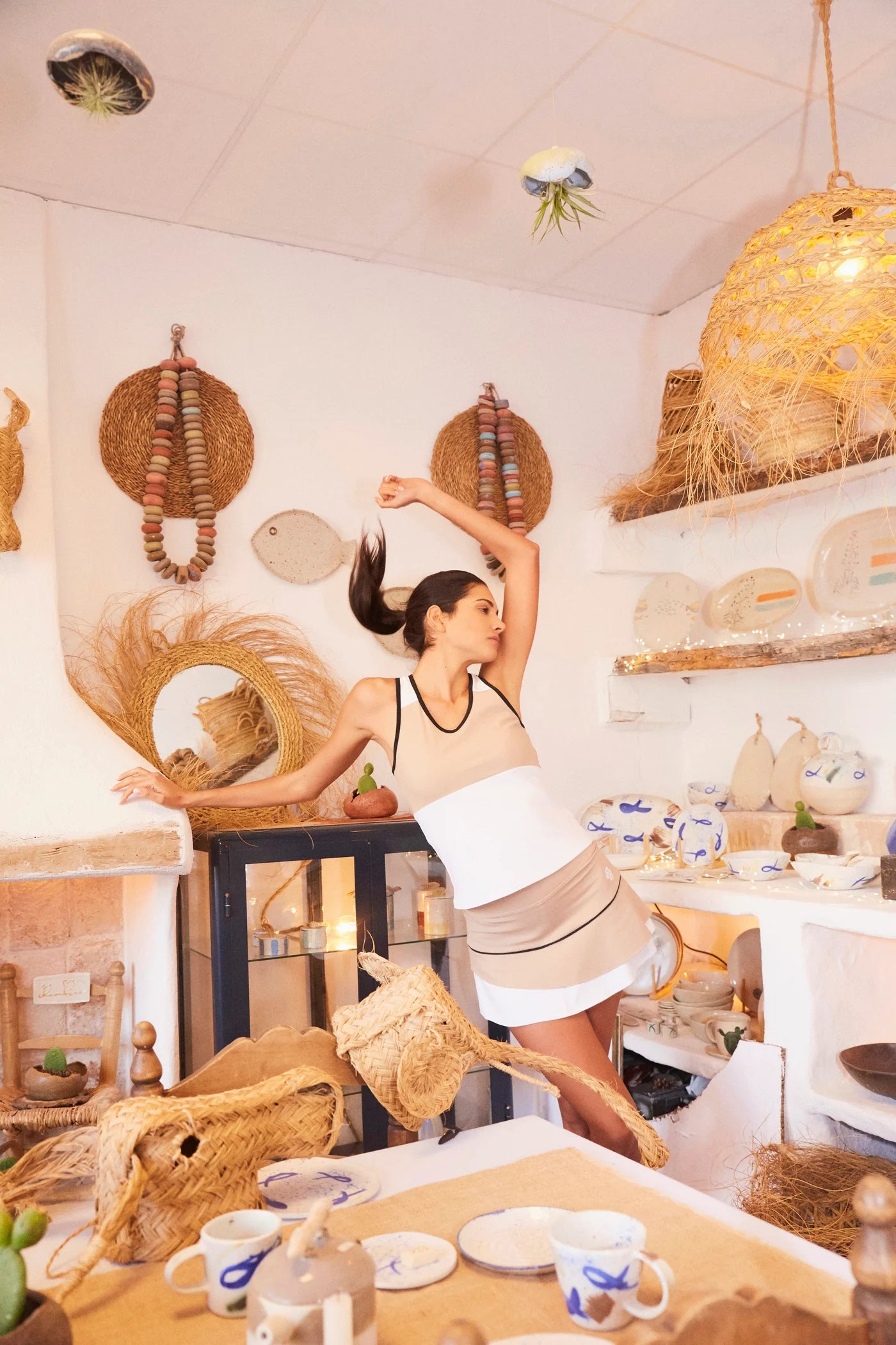 Discover our Kali Baige V-neck tank top, designed to take your game to the next level in padel, tennis, and pickleball. Made with high-quality fabric, this top offers a perfect combination of comfort and performance on the court. Its design features a contrasting texture that adds a touch of style and dynamism to your sportswear. Made with breathable materials, it keeps you cool and dry throughout the match, allowing you to focus on your game without distractions. Whether you're competing in a tournament or enjoying a training session, this top is the ideal choice for those looking to stand out with style and confidence on the court.