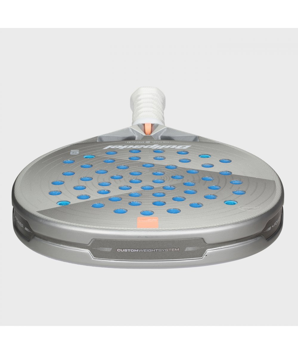 Custom Weight – It is located in the Metalshield protector compartments, where up to 3 aluminium adhesive plates, each weighing 3 grams, can be placed, allowing the racket’s change of weight and balance. It provides more control, power, and balance considering each player’s needs.