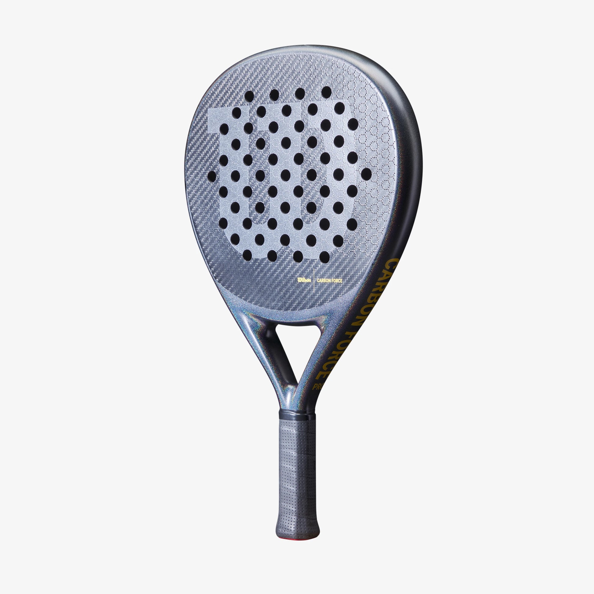 Wilson's Carbon Force Padel Rackets became iconic for a reason, and the latest versions integrate updated technology to help you improve your game. Competitive players gravitate to Wilson's Carbon Force Padel Rackets for their mix of playability and control. Designed with EVA Foam, this teardrop-shaped racket offers a high level of precision in defensive play. With its large sweet spot, it's a forgiving racket for players who are looking to add more power and control their game. And even though this racket's built for control, it still offers a lot of speed on volleys and smashes. The carbon fiber face delivers impressive power, and it comes with a textured grip for extra spin on the ball.